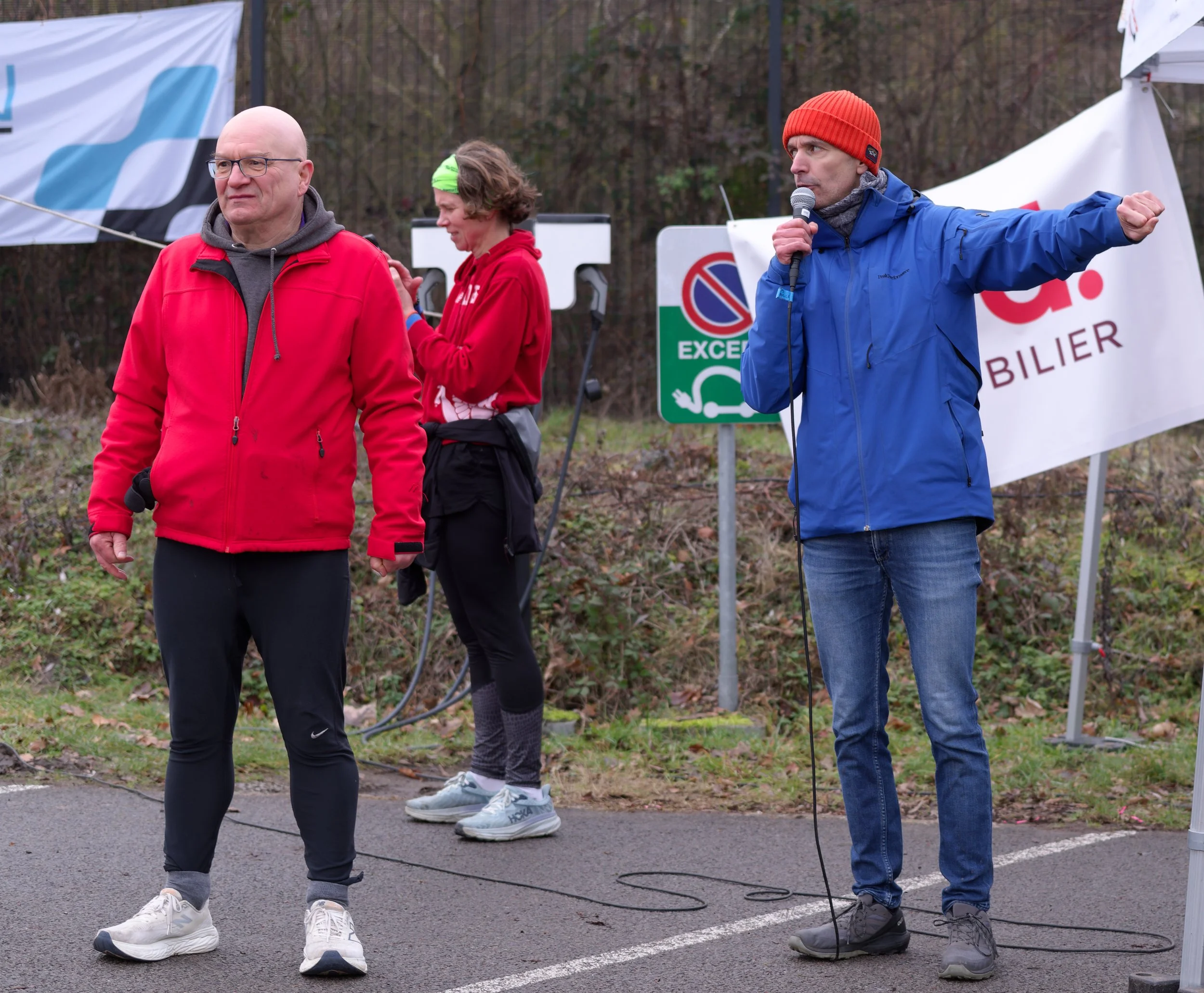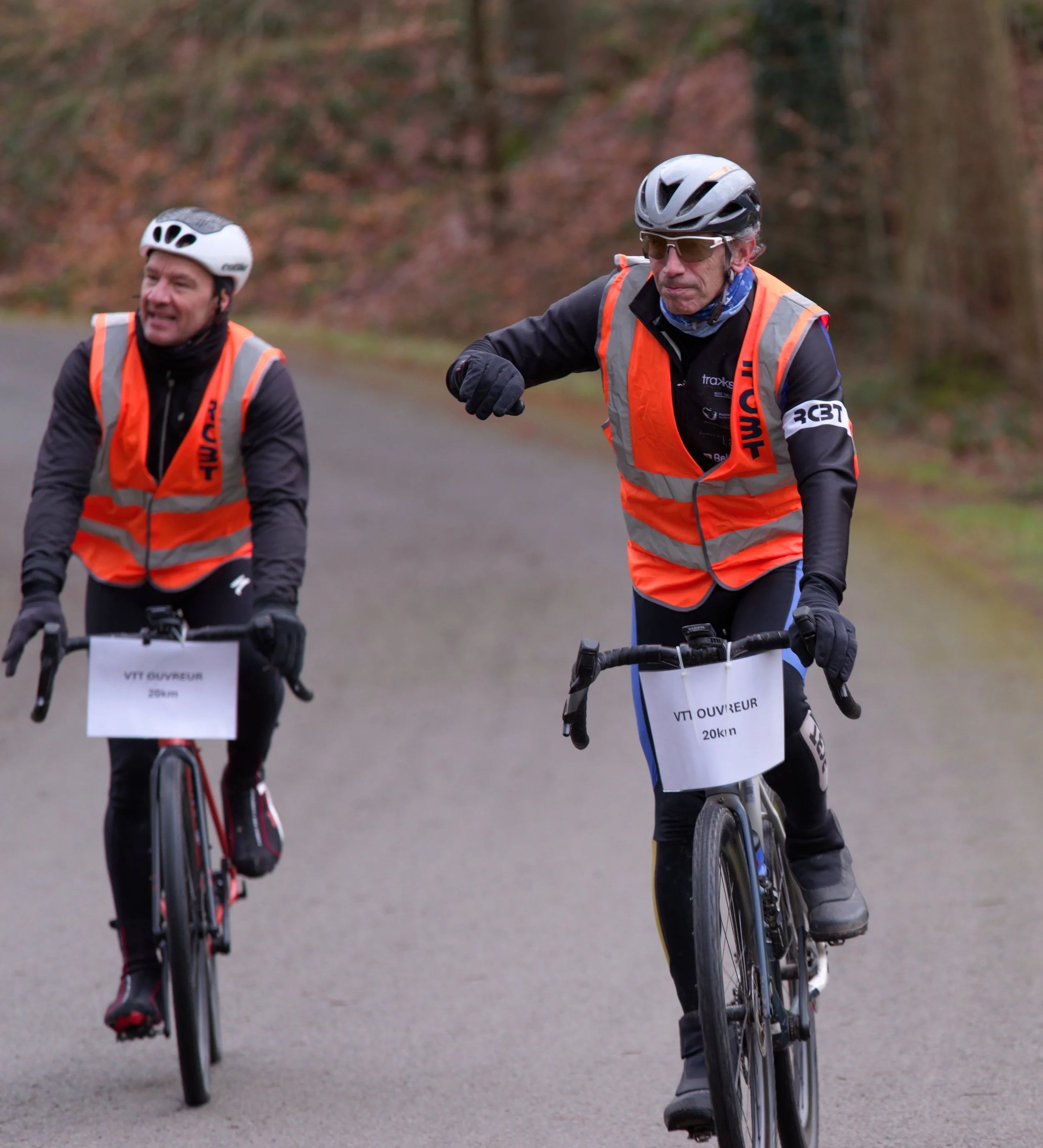 La vision du premier duo de sympathiques signaleurs indique que tout est en place avant le départ des 20 km. N’oublions pas que le bon déroulement de l’épreuve dépend beaucoup du travail de ces bénévoles (et de tant d’autres aux diverses fonctions), surtout qu’elle offre trois parcours différents, aux nombreux changements de direction.