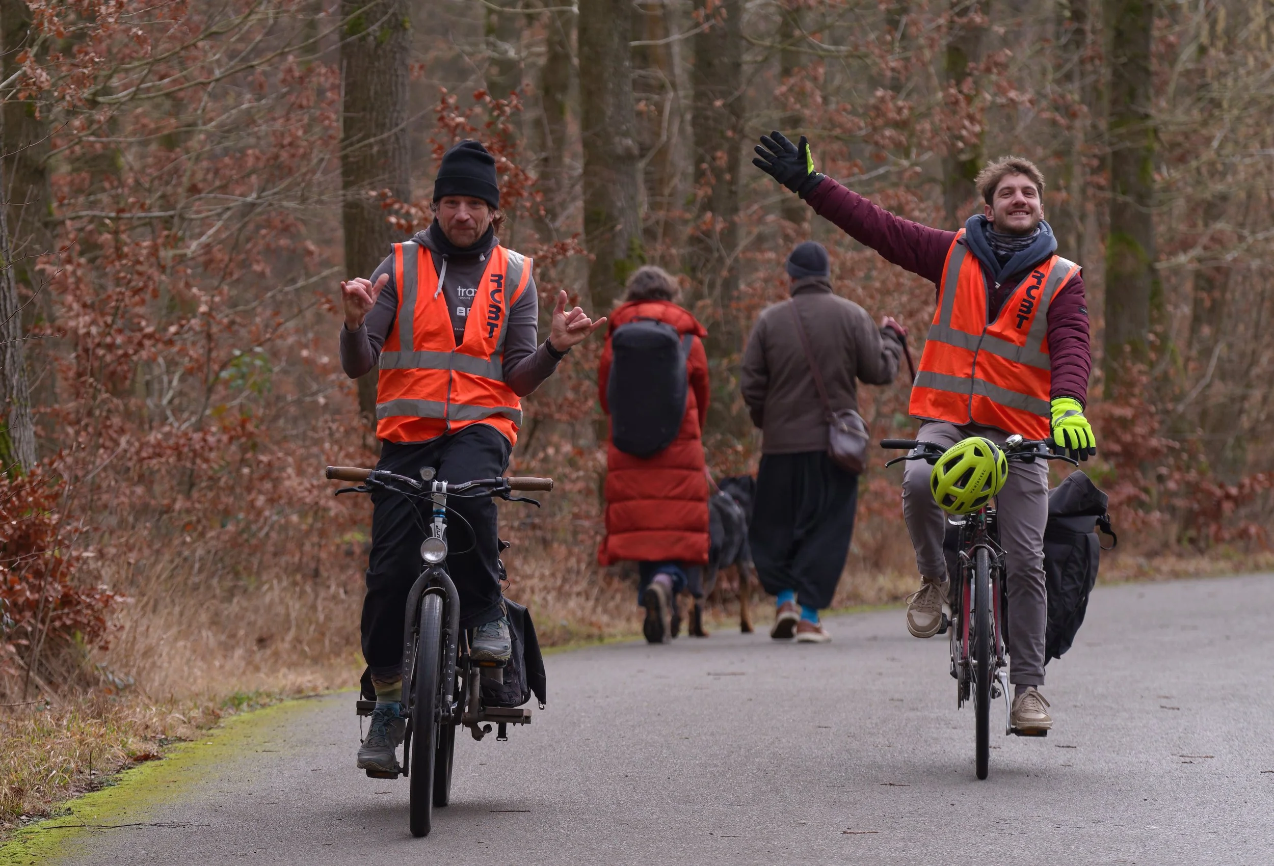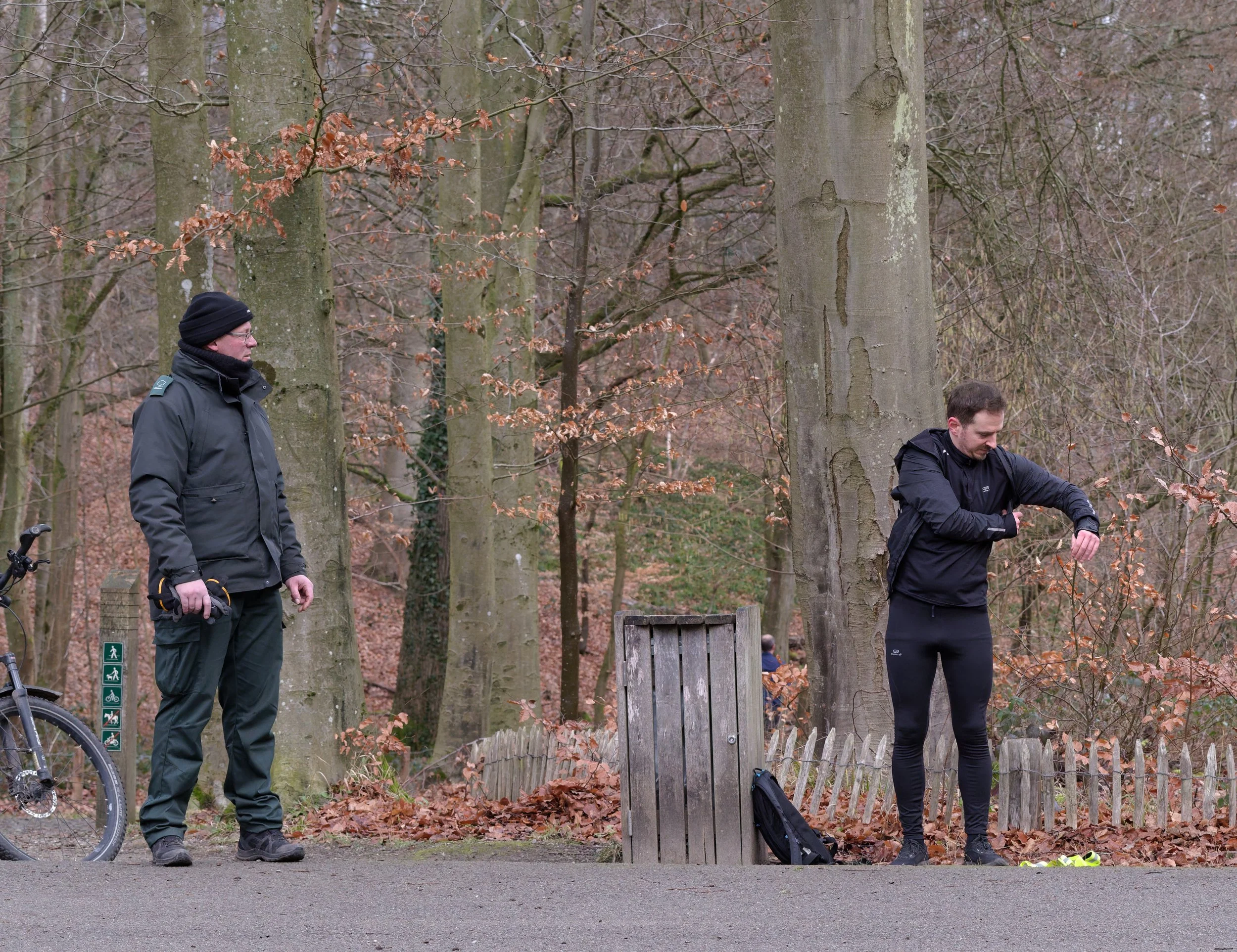 Le duo d’ouvreurs précède le premier groupe. Le geste indiquant aux passants de s’écarter du chemin déplait au garde-forestier, qui rappelle que l’autorisation permet d’utiliser les chemins pour la compétition mais pas d’en exclure les autres visiteurs. Il s’agit d’un fonctionnaire très soucieux des règles établies pour protéger la forêt et la cohabitation de ses usagers. Quelques instants auparavant, il avait hélé un promeneur lointain pour lui faire remettre la laisse à son chien. Pensons tout de même que des réclamations provenant d’autres visiteurs pourraient inciter les autorités à limiter les autorisations de compétition.